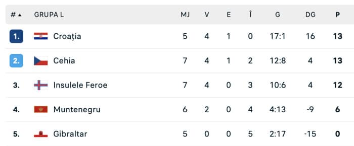 Clasamentul din Grupa L, după Insulele Feroe – Cehia 2-1