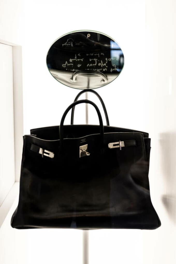 Oferită de casa de modă Hermes lui Jane Birkin în 2003, această poşetă din piele neagră, folosită şi decorată cu însemnări scrise de mână de cântăreaţa şi actriţa britanică decedată în 2023, este una dintre cele patru poşete pe care artista le-a primit după ce şi-a vândut prototipul emblematic, în 1994, în beneficiul unei asociaţii din domeniul luptei contra SIDA.